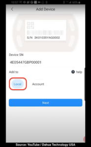 Step 4: Make sure the QR code is scanned properly. If not this screen lets you manually type the Device SN. Select “Local” and click Next.